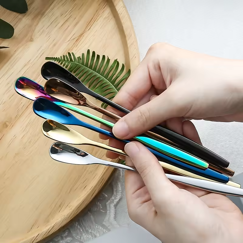 Thin spoon - Coffee, tea, dessert - 5 colors Stainless Steel 304 Size : 13.5 x 3 cm Weight : 16,2g Colors : silver, rosegold, gold, rainbow, black